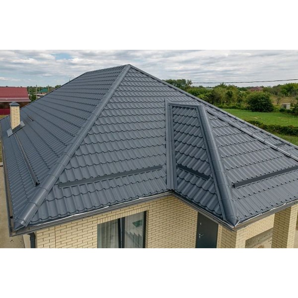 Классический профиль «Монтеррей» имитирует натуральную черепицу и формирует выразительный объем кровли. Металлочерепица изготавливается из оцинкованной стали с надежным полимерным покрытием, которое обеспечивает защиту от коррозии, ультрафиолетового излучения и температурных перепадов. Цвет «графит» устойчив к выгоранию и сохраняет насыщенность на протяжении всего срока службы.